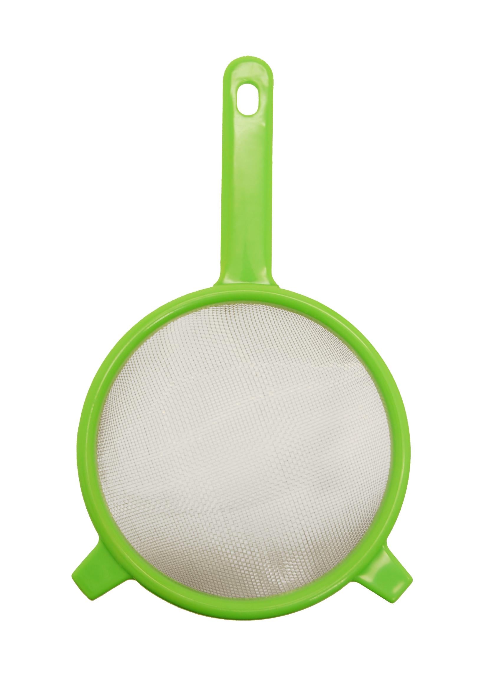 A stainless steel strainer with a green plastic frame. Perfect size for our 1 gallon wide mouth jar. A must have for any DIY Kombucha brewer.