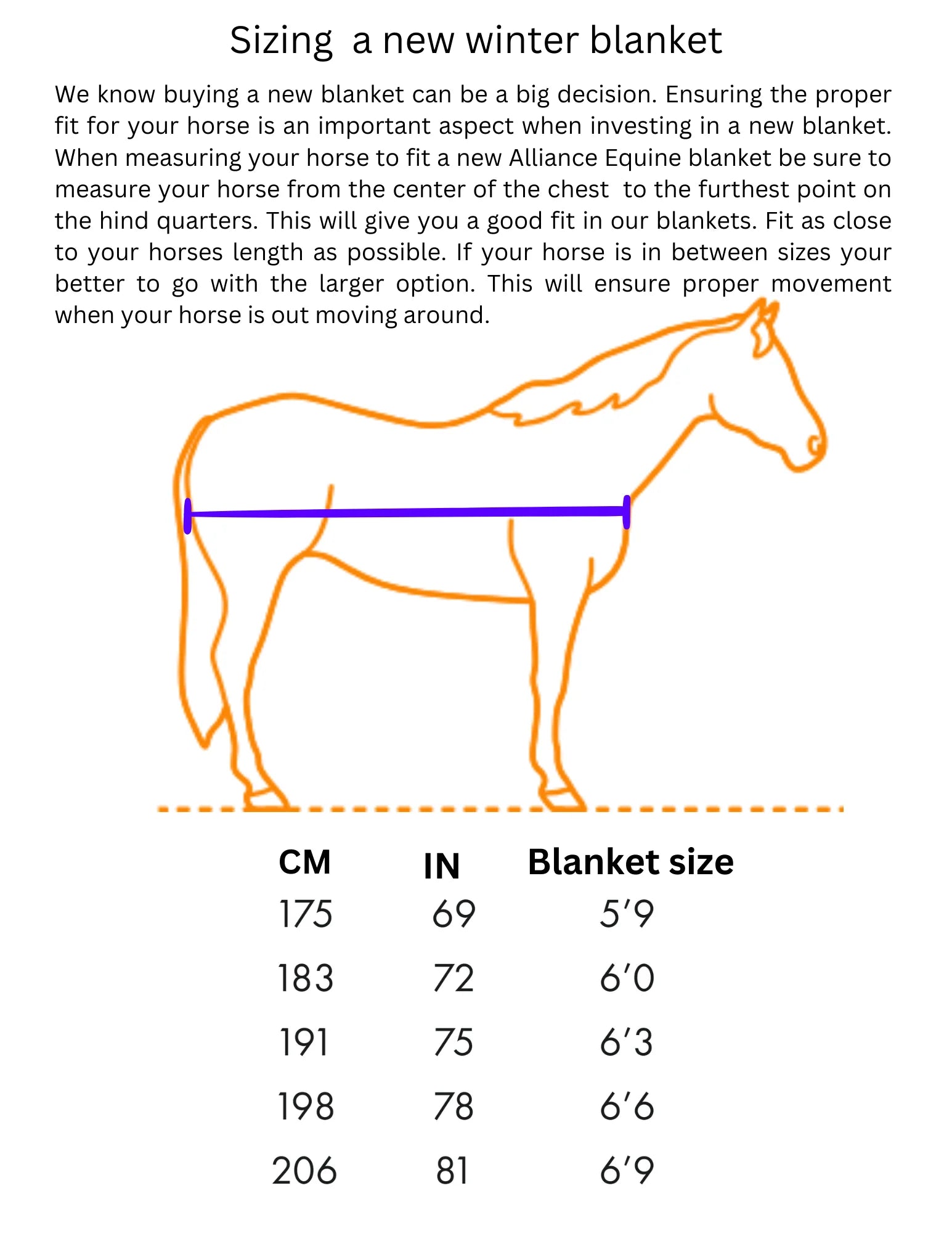 Sizing Guidance: Choosing the right size is crucial for optimal comfort. Measure your horse from the center of the chest to the furthest point on the hindquarters, aiming for a fit as close to your horse's length as possible. Opt for the larger size if your horse falls between sizes to ensure unrestricted movement.