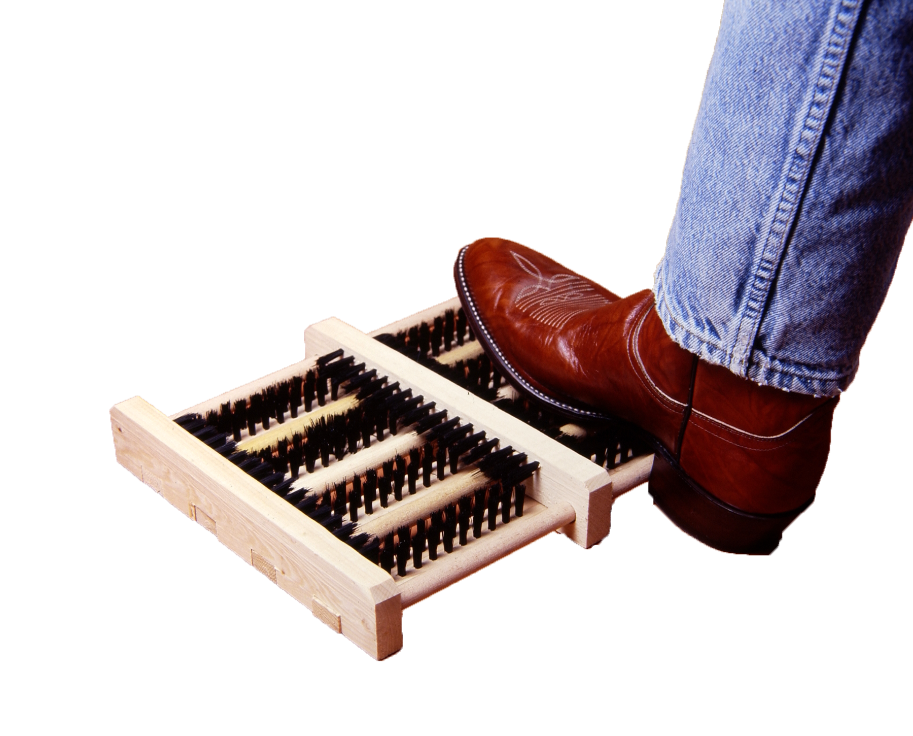 Nylon Brushes mounted into a solid wood frame. Cleans bottoms and both sides at once. 13" x 11"