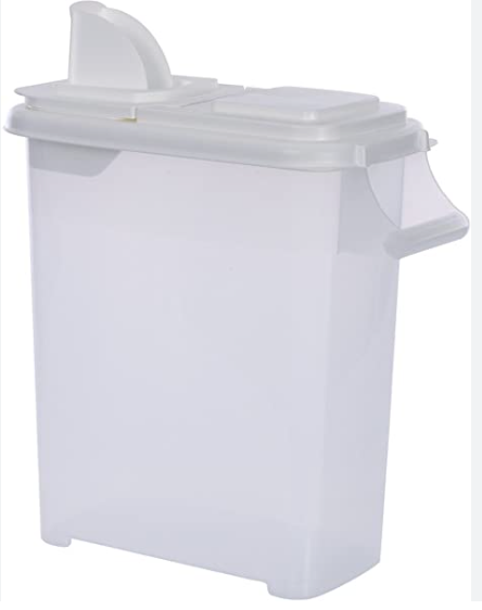 Lid features a flip-up pouring spout for neat and controlled refills, while the heavy duty grip makes lifting and handling heavy bags a breeze. The narrow profile and stackable design enables convenient, space-saving storage for all of your needs. Dispenser is great for pet foods, bird seed, wood pellets, lawn and garden products, endless uses. BPA free and food storage safe (black lid containers)