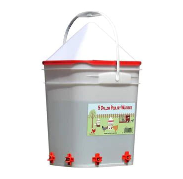 New Horizontal nipples prevent ground/bedding from getting wet. Rest your bucket on the ground when filling with water! 2 gallons lasts 4 hens more than 5 days! Easy to fill - Removable capo on lid. No need to hang!