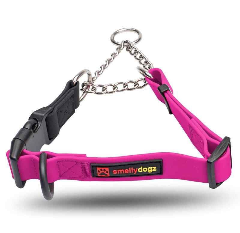 The martingale collar is a gentle yet effective training collar with a limited tightening effect. Our martingale collar is very versatile and can adjust to give your dog the perfect fit. The proprietary D-ring is coated to protect the metal finish, as well as reduce that metal-on-metal sound.