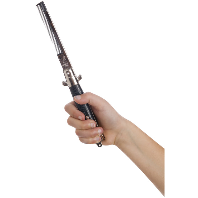 Unlock, flip the switch, and comb away! Springloaded comb pop open with a push of button. Measures 5" closed.