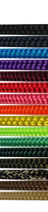 The halter is crafted of 3/16 firm halter cord and the lead of 3/8 soft cord. The lead is finished with one straight cut end and fitted onto the halter by a 2 loop.