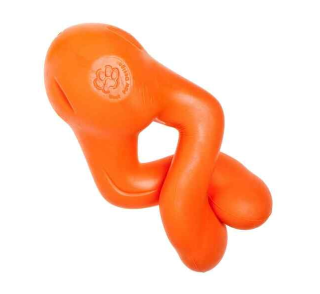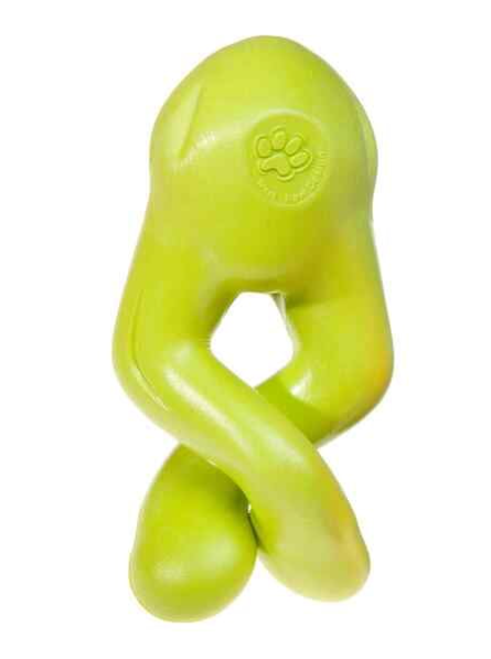 Small is 4.5". Large is 7". This cleverly designed treat toy for dogs has multiple functions. Toss in the air for a fun game of fetch on water and land! Or stuff its compartment full of your dog's favorite treats and twist the handles to make pup work harder to get the treats out.