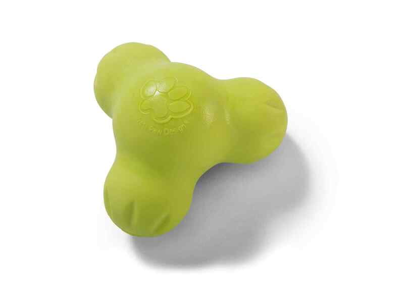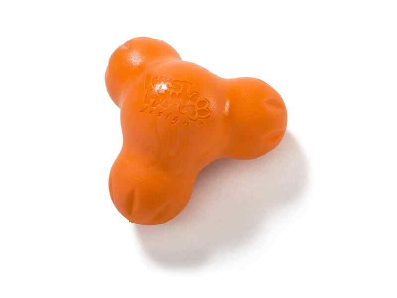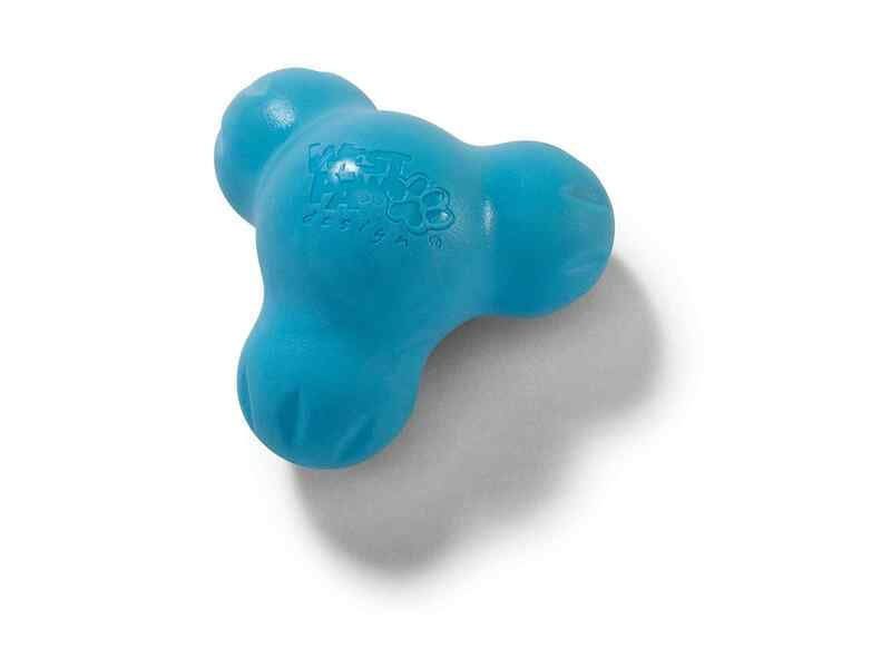 Small is 4". Large is 5". With three solid lobes, Tux is our toughest treat toy - made to stand up to some fearsome fangs. Nut butters, biscuits, and meaty bits all get gnawed free whenever a dog is near. Once treats are long gone, Tux floats, bounces, and hangs tough through serious chew sessions.